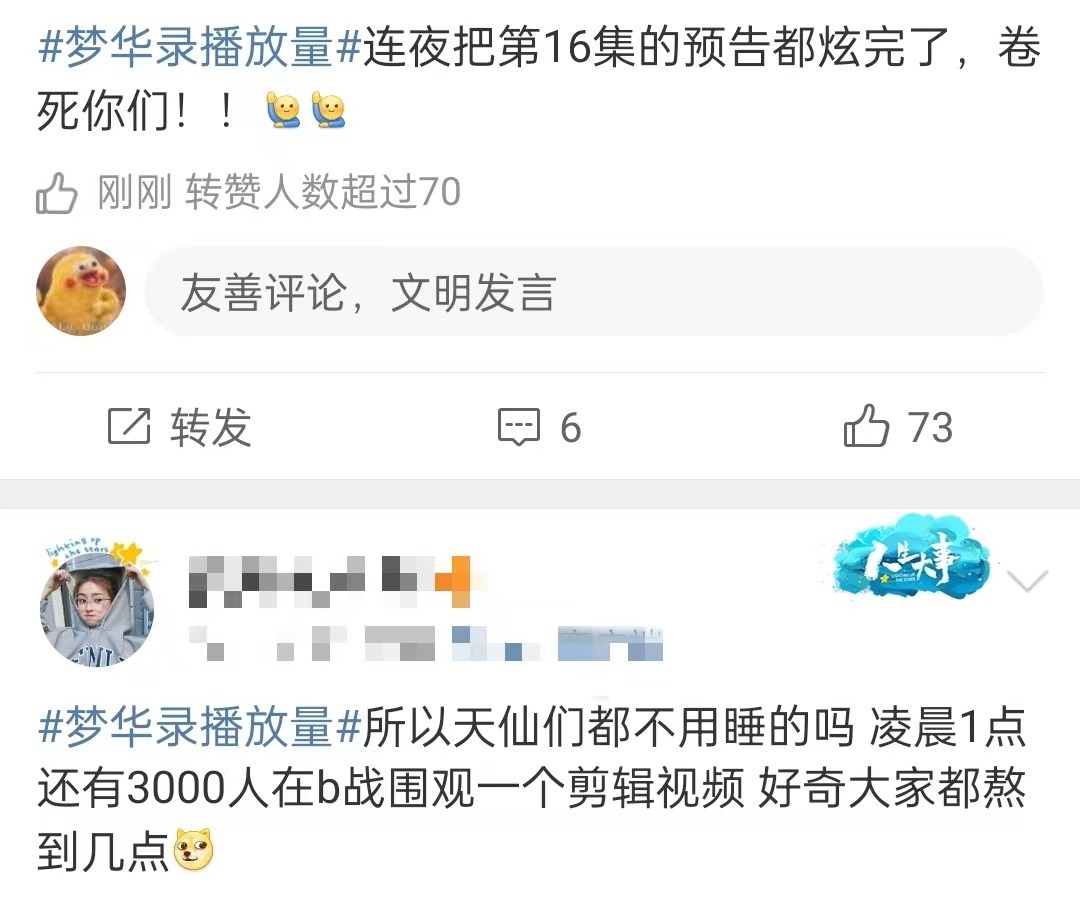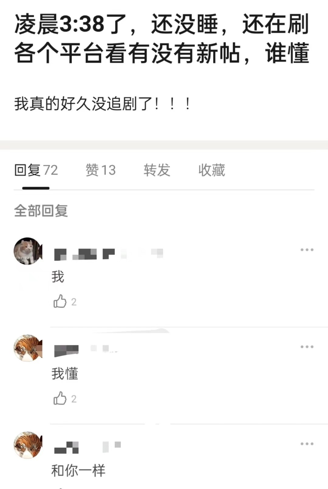 网上有关“熬夜一口气追了十几集”的言论已经成了热潮,连网友们自己都纷纷感慨,上次这么追剧是很久以前了。无聊的大家还开始了可爱的攀比,表示连夜把预告都看完了,势要“卷死”别人。更是有不少观众刚刚看完就开始催更,恨不能一口气看完全集。