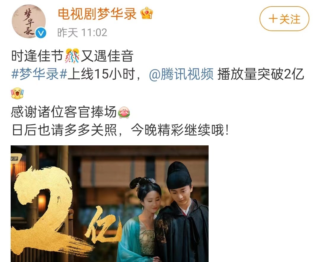 早在《梦华录》刚上线15小时的时候,官博就发布了庆祝博文表示播放量已经突破2亿,足以见得观众们对这部剧的“狂热程度”。