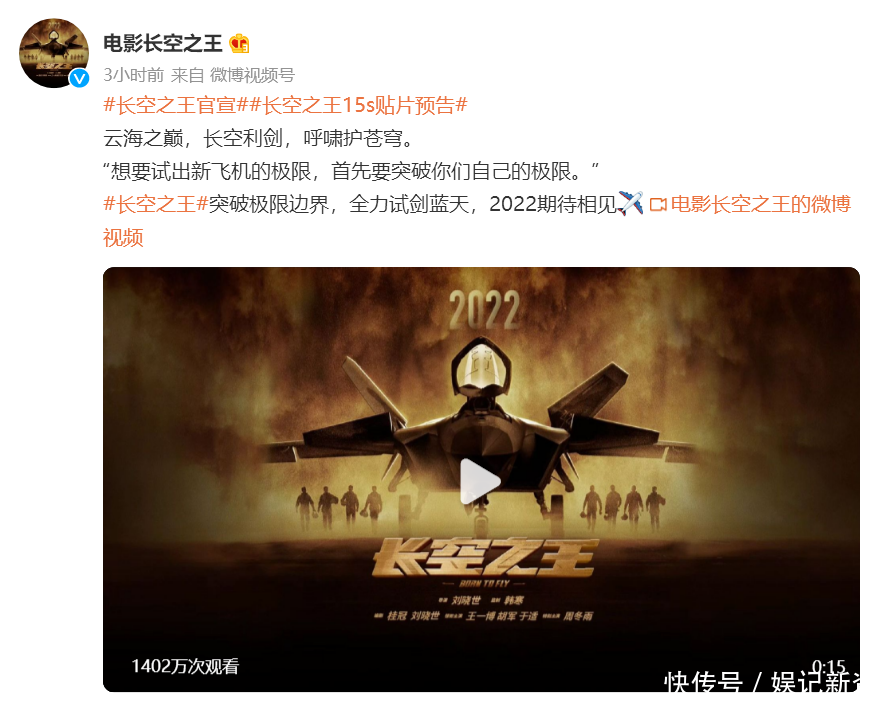 随后官方微博还晒出了一段十五秒的视频,里面只有一句台词,那就是:想要试出新飞机的极限,首先要突破你们自己的极限。画面也是很燃,一架飞机在长空中划过,随后各位主演分别亮相,最后也是以一架飞机划过结尾。