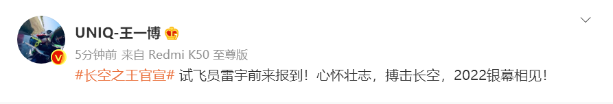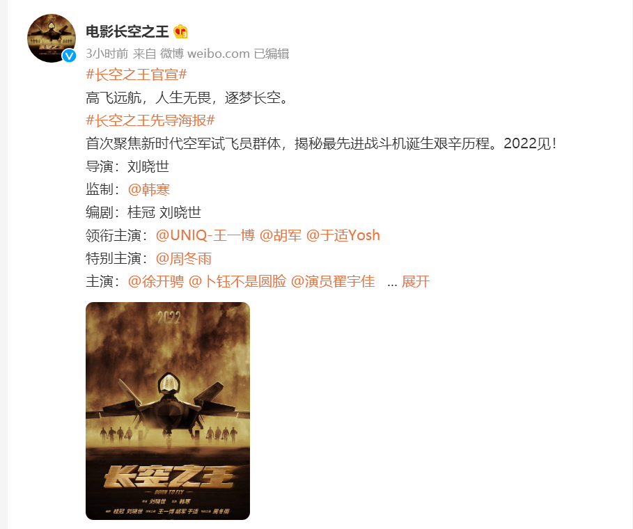 8月13日,《长空之王》官方微博晒出新海报称:高飞远航,人生无畏,逐梦长空。首次聚焦新时代空军试飞员群体,揭秘最先进战斗机诞生艰辛历程。2022见!正式官宣这部剧将在2022年上映。