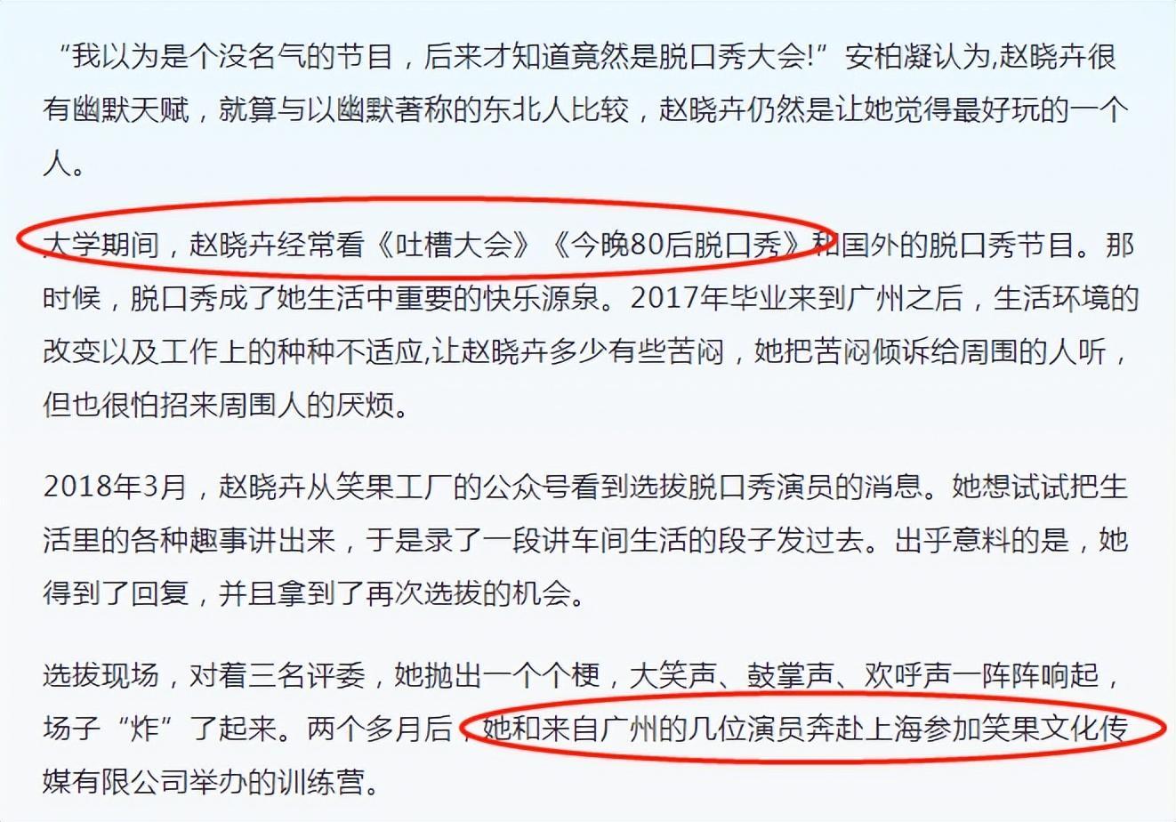大学期间,赵晓卉就喜欢听李诞他们讲脱口秀,慢慢就喜欢上了脱口秀,自己也想试一试。